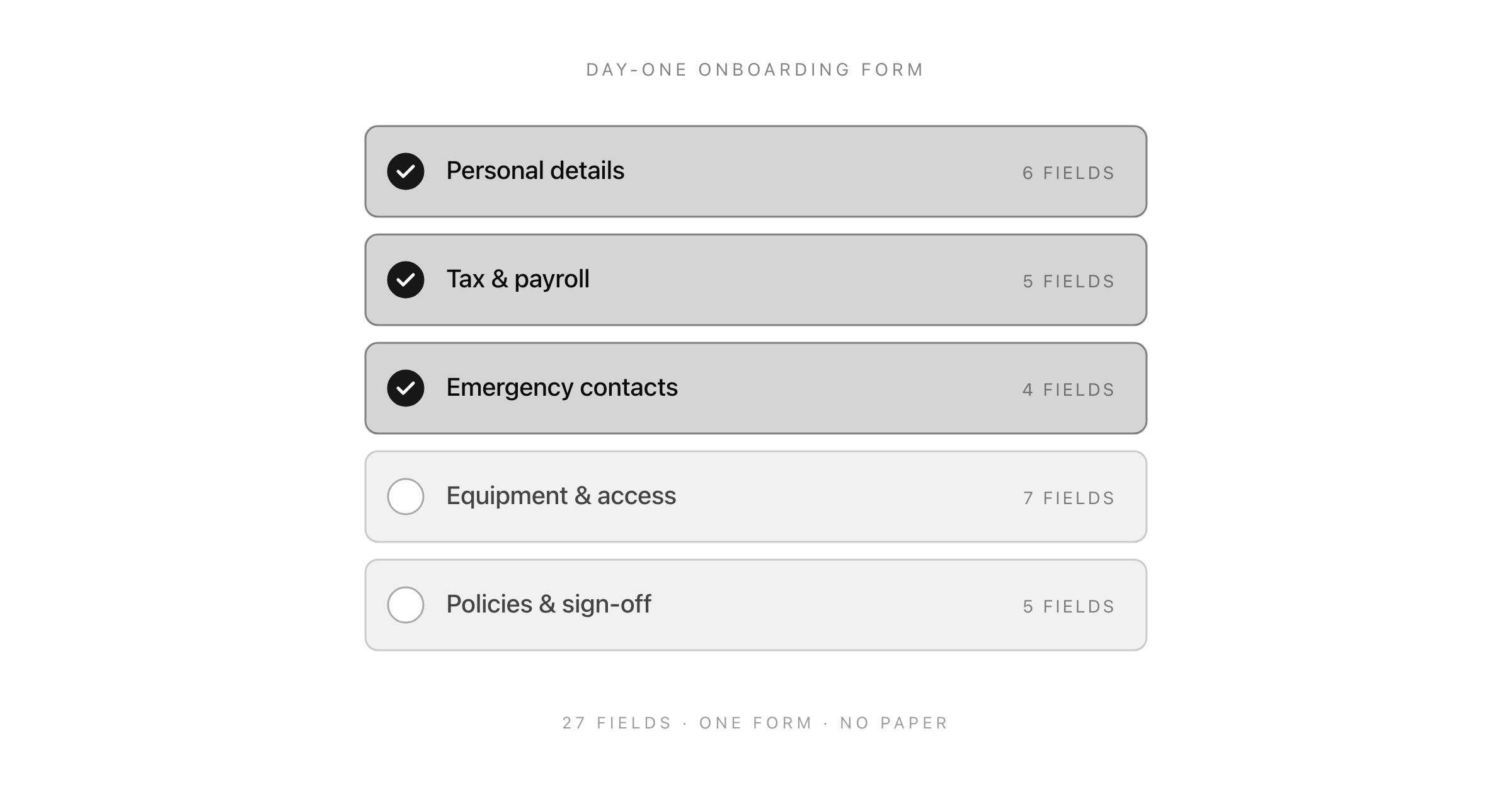 - One form, not eight. Five sections: personal, tax and payroll, emergency, equipment and access, policies and sign-off.