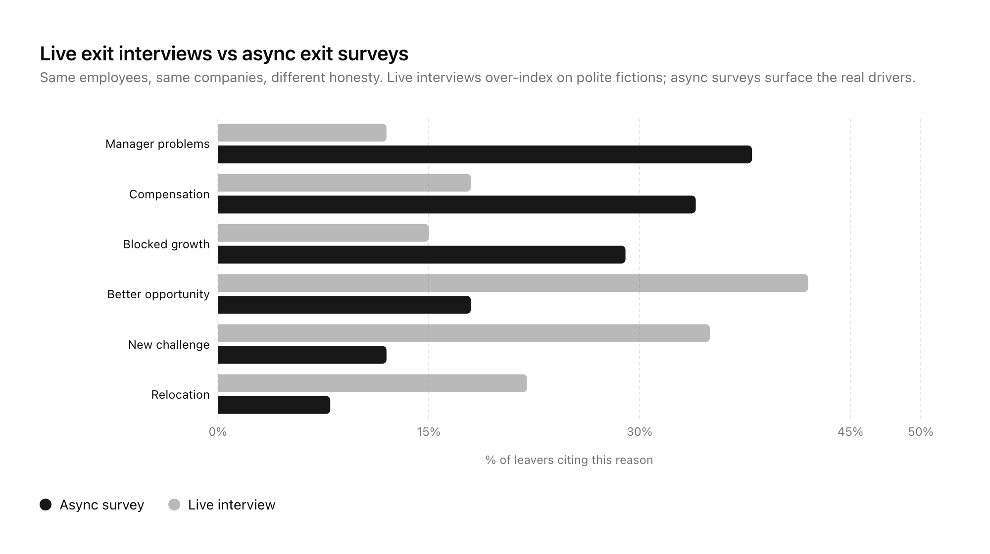 Notice the gap in the chart above. In live, in-person exit interviews, the most common answers are variations on "I got a better opportunity" and "I need a new challenge." In async, anonymous exit surveys conducted 1-2 weeks after departure, the top answers shift dramatically toward specific manager issues, compensation gaps, and blocked career growth. Same employees, same companies, different data. The format determines the honesty.