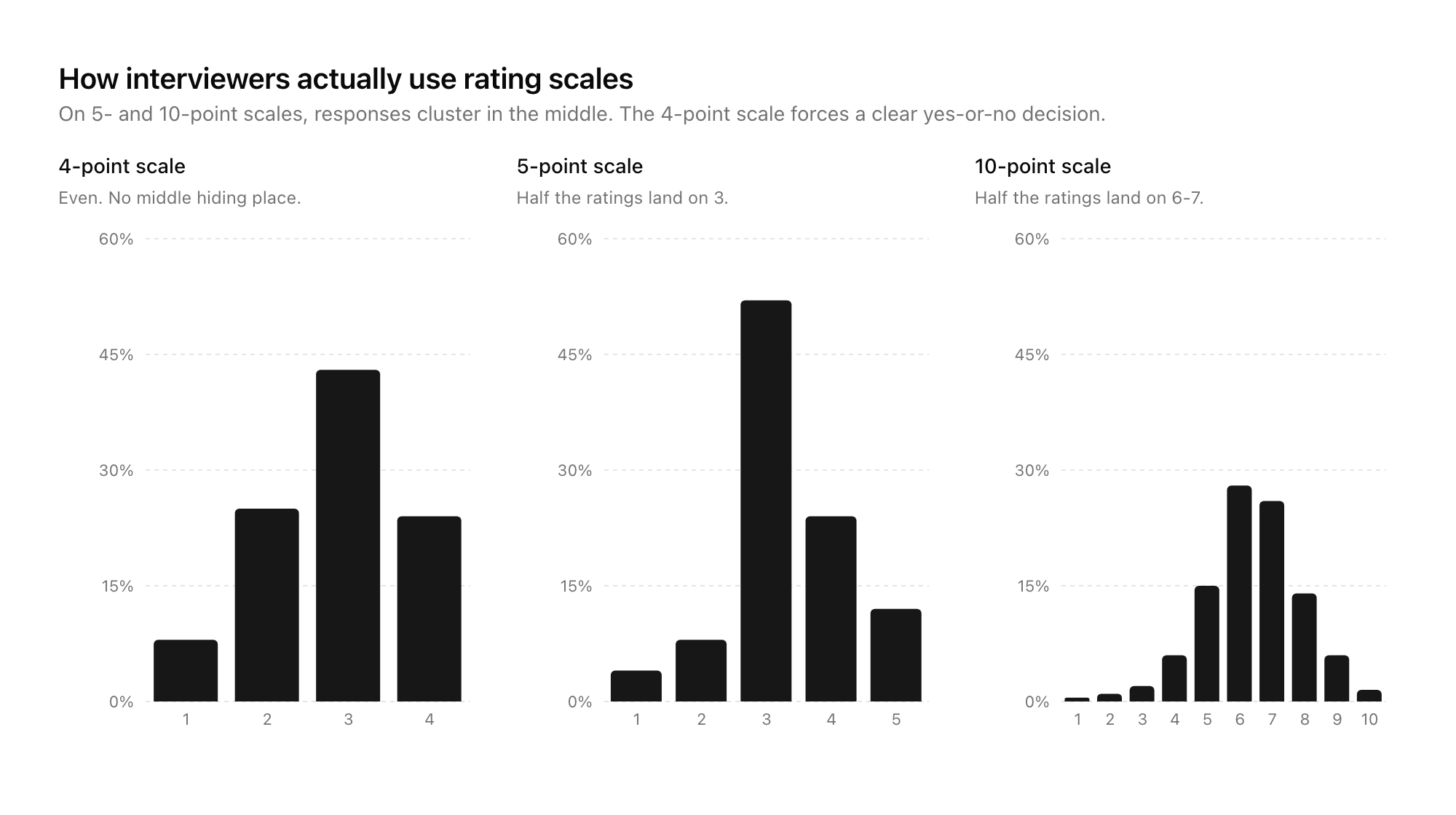 Why not 10? Because on a 10-scale, interviewers cluster everything into 6–8. You lose all the resolution in the middle band where decisions actually happen.