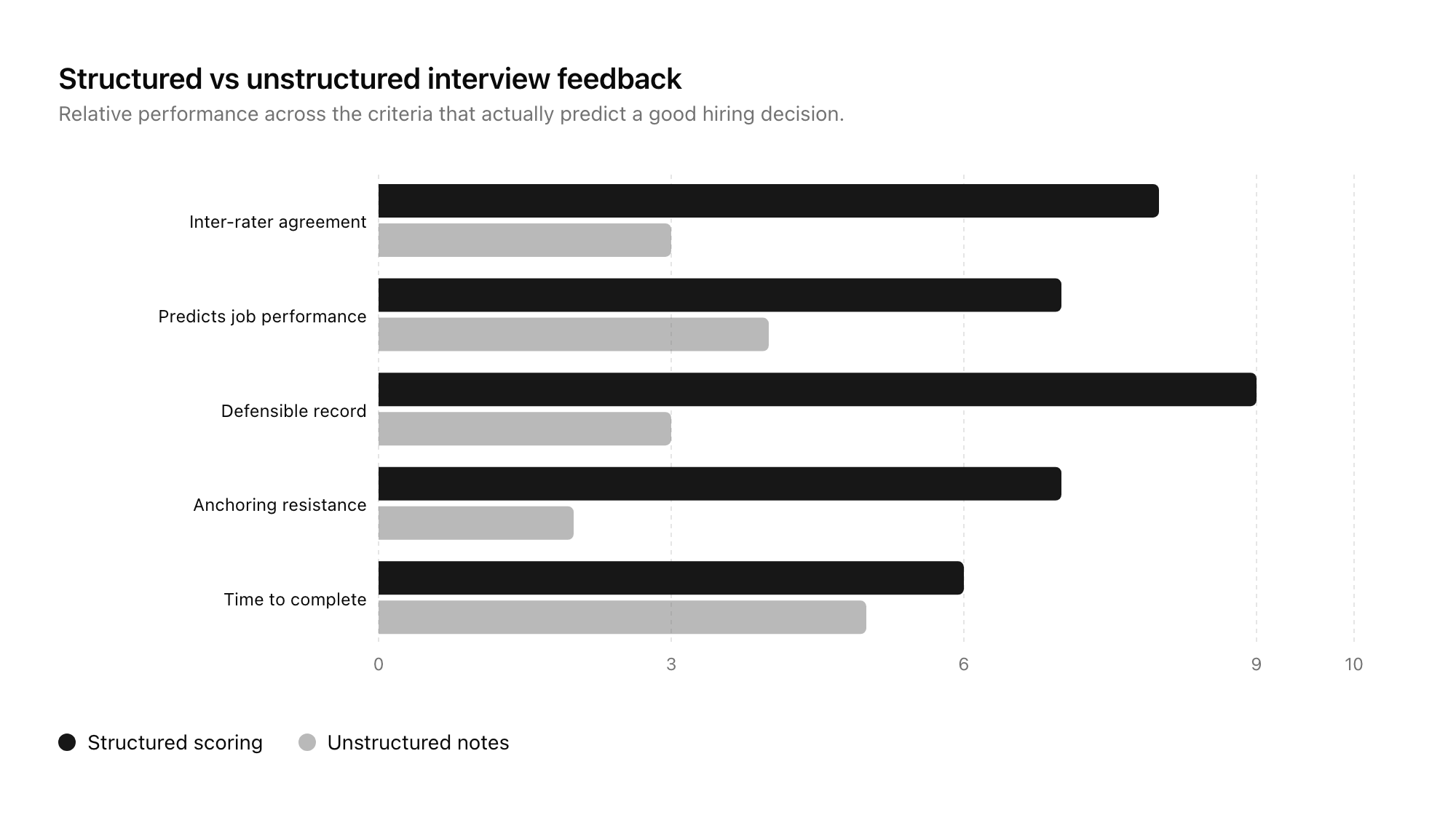 The case for structured over free-text isn't a style preference. Google's Project Oxygen and countless industrial-organisational psychology studies have shown that structured scoring on predefined criteria consistently predicts job performance better than unstructured interviews with free-form notes. The same pattern holds for the feedback stage: when interviewers score against a fixed rubric, the hiring team agrees with one another more often and bad hires drop.