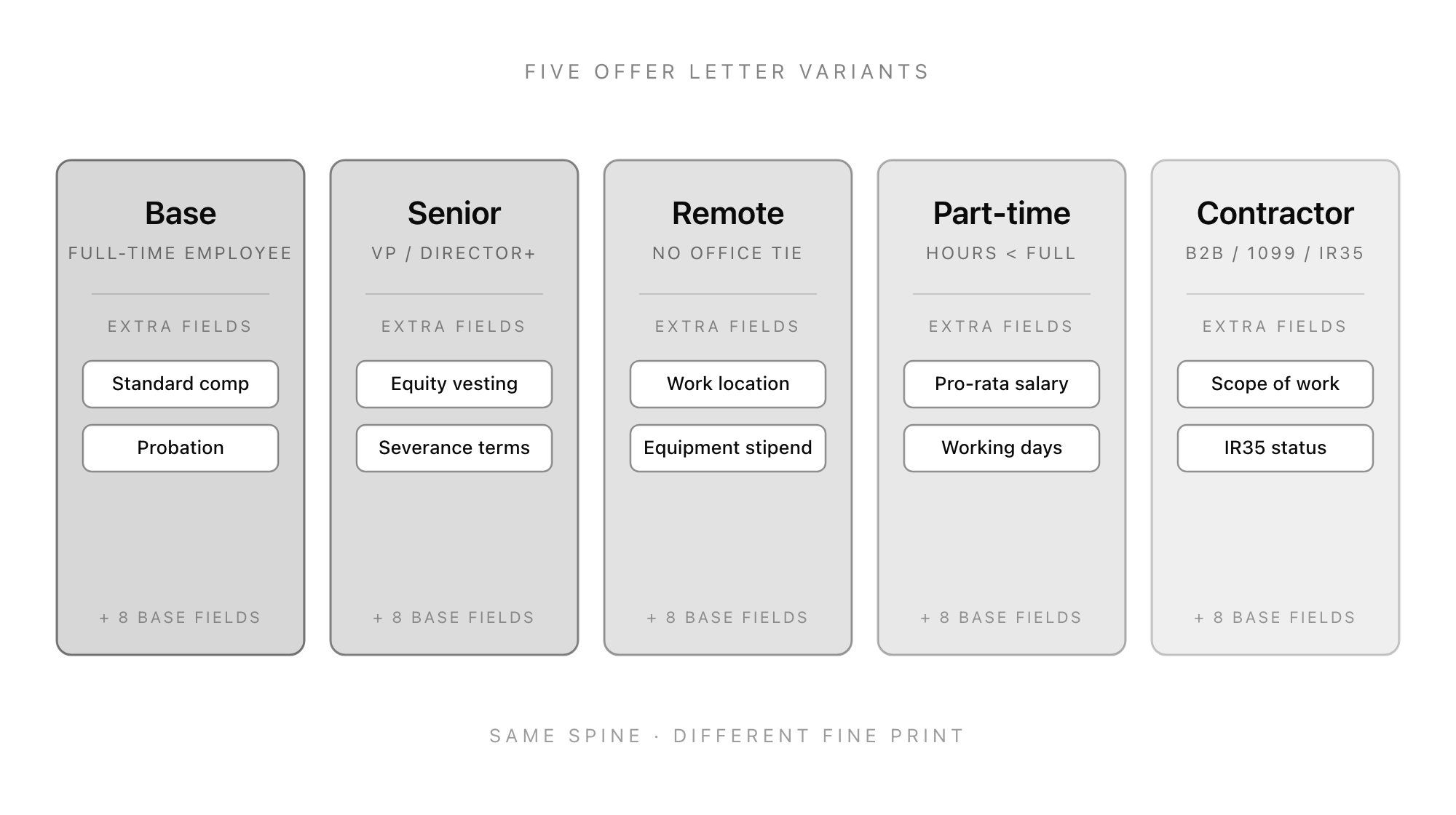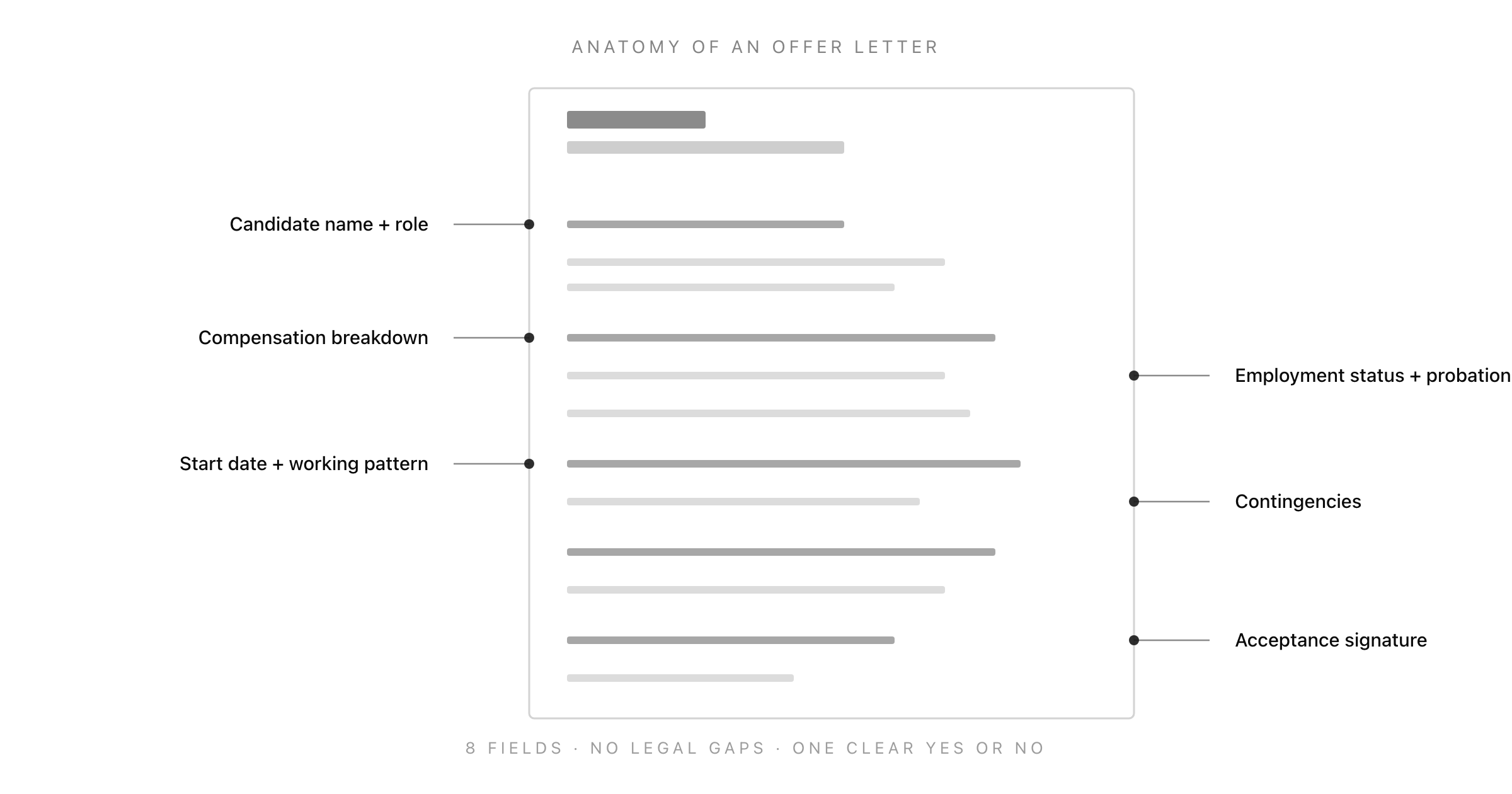 - Every offer letter needs 8 non-negotiable fields. Anything more is optional, anything less is a legal gap.